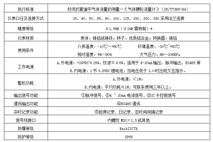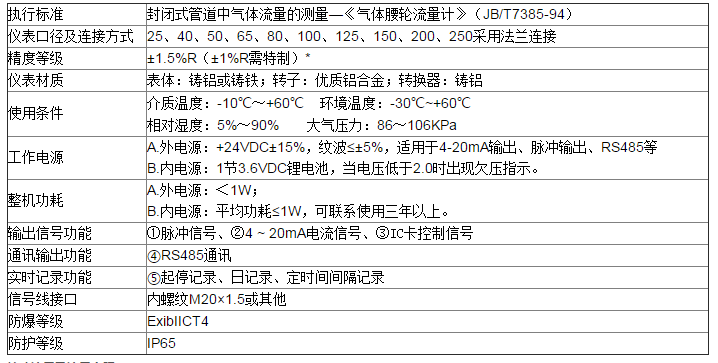 三、天然氣氣體羅茨流量計技術(shù)性能指標