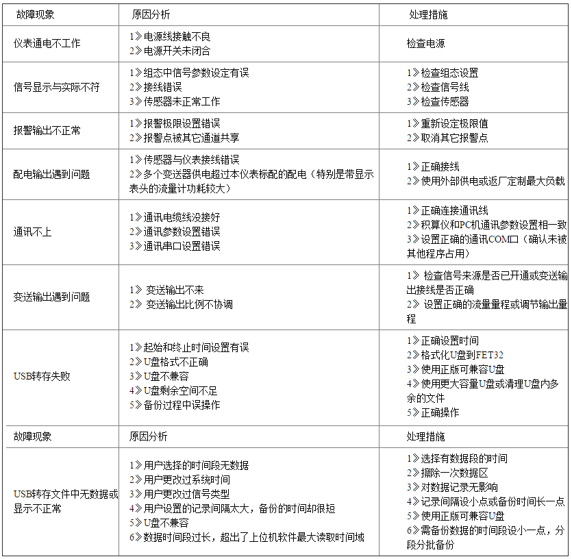 本流量積算記錄儀采用了先進(jìn)的生產(chǎn)工藝,出廠前進(jìn)行了嚴(yán)格的測(cè)試,大大提高了儀表的可靠性。常見(jiàn)的故障一般是操作或參數(shù)設(shè)置不當(dāng)引起的。若發(fā)現(xiàn)無(wú)法處理的故障,請(qǐng)記錄故障現(xiàn)象并及時(shí)通知當(dāng)?shù)卮砩袒蛘吆臀覀兟?lián)系。